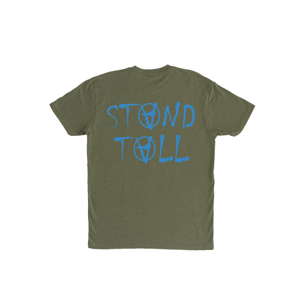 Super soft poly-cotton blend t-shirt. Military Green or Navy color shirt with powder blue screen printing on the front and back.
