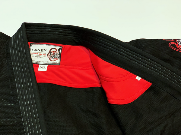 The latest version of our flagship gi. The PRO 550 v3 is a slim fitted, 550 GSM Pearl Weave with 10 oz Ripstop pants in black. It features embroidered Lanky Octopus logos on both shoulders and the right pant leg. The LANKY|FG logo is featured on the back the jacket. Gray contrast stitching with red accents, custom seam tape, and the new sublimated shoulder lining really set this gi apart. Triple reinforced stitching on all major stress points make this gi durable. Collar is quick drying EVA foam. Pants feature a six-loop system with bungee type drawstring and a gi material gusset for extra strength and knee reinforcements all the way to the end of the pants. Comes with a sublimated gi bag.